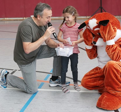 Es war ein toller Moment, zu sehen, dass der Fuchs ein Lachen in die Gesichter aller Anwesenden zauberte. Aber so, wie das mit allen Maskottchen ist, musste auch hier erst ein Name für den Fuchs gefunden werden.Ich bat die Anwesenden, sich einen Jungennamen auszudenken, zu notieren und in eine Box einzuwerfen.